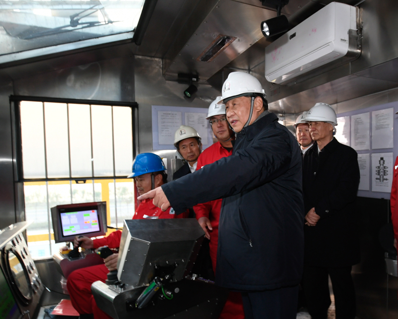 10月22日下午,中共中央總書(shū)記、國家主席、中央軍委主席習近平在山東省濟南市主持召開(kāi)深入推動(dòng)黃河流域生態(tài)保護和高質(zhì)量發(fā)展座談會(huì )并發(fā)表重要講話(huà)。這是座談會(huì )前,習近平21日下午在位于東營(yíng)市萊州灣的勝利油田萊113區塊考察時(shí),登上二層鉆井平臺,察看鉆井自動(dòng)化設備。新華社記者 李學(xué)仁 攝